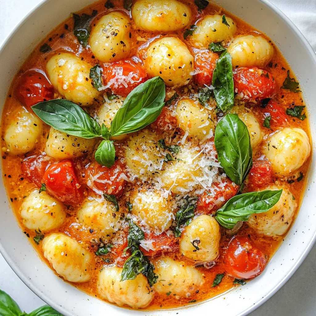A delicious and creamy one-pot dish featuring gnocchi, tomatoes, and fresh basil.
