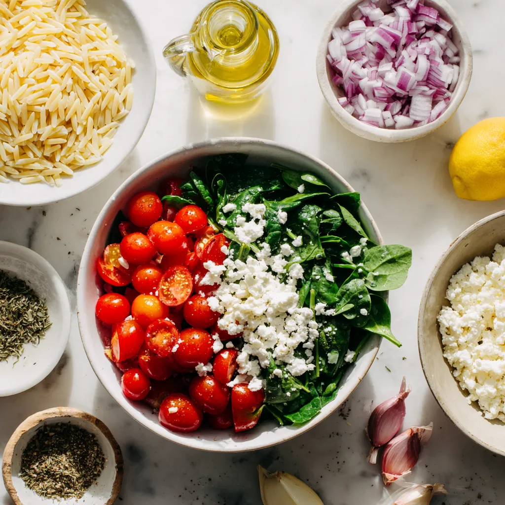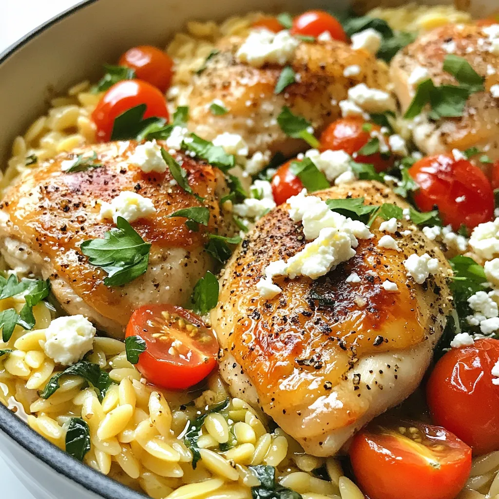 Start by gathering all your ingredients. You will need chicken, orzo, and veggies. Chop the red onion and mince the garlic. Cut the chicken thighs into bite-sized pieces. Halve the cherry tomatoes and roughly chop the spinach. Crumble the feta cheese for later. It’s best to have everything ready before cooking. This way, you can move quickly and enjoy the process.