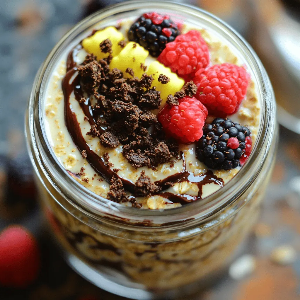 Don’t forget crushed chocolate cookie crumbs. They add crunch and fun. You can top the oats with fresh berries or banana slices. This is optional but adds freshness and color.