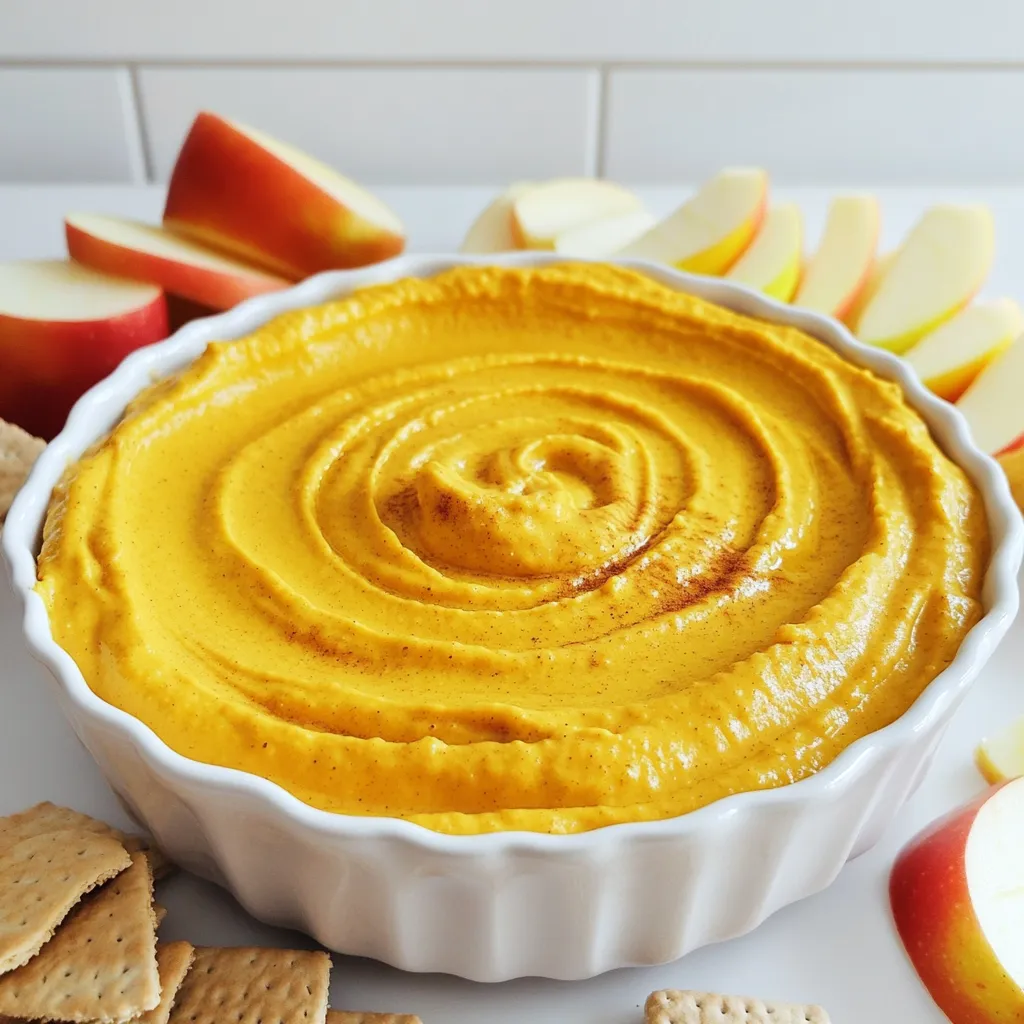 To make this rich and creamy pumpkin cheesecake dip, you need a few key items: - 1 (8 oz) package cream cheese, softened - 1 cup canned pumpkin puree - 1/2 cup powdered sugar - 1 teaspoon vanilla extract - 1 teaspoon ground cinnamon - 1/2 teaspoon ground nutmeg - 1/4 teaspoon ground ginger - 1/4 teaspoon salt - 1 (8 oz) tub of whipped topping These ingredients create a smooth base that balances sweetness and spice. You can add more flavor with these optional ingredients: - A splash of maple syrup for extra sweetness - Chopped pecans for a crunchy texture - A dash of allspice for warmth These options can make your dip even more special. When serving this dip, you have fun choices for dippers: - Graham crackers for a sweet crunch - Apple slices for a fresh bite - Pretzels for a salty twist Each option adds a different taste and texture to your dip experience. To start, gather your ingredients. You need softened cream cheese and canned pumpkin puree. Place both in a mixing bowl. Use a hand mixer or stand mixer to blend them. Mix until the mixture is smooth and creamy. This step is key for a rich base. Next, add powdered sugar gradually. Mix well until it is fully combined. Then, add vanilla extract, ground cinnamon, nutmeg, ginger, and salt. Stir until these flavors blend into the mixture. This combo makes your dip taste like fall in every bite. Be sure to taste it! You can adjust sweetness or spice levels if needed. The last step is to fold in the whipped topping. Do this gently to keep it light and fluffy. This folding is crucial for a creamy texture. Once combined, transfer the dip to a serving bowl. Creating a swirl pattern on top is a fun touch. Then, cover and chill for at least 30 minutes. This helps the flavors mix and enhances the dip's taste. You can make this dip a day ahead. Mix the cream cheese and pumpkin as stated. Cover the bowl with plastic wrap and chill. This allows the flavors to deepen. You can serve it cold right from the fridge. Taste your dip before serving. If you want it sweeter, add more powdered sugar. For extra spice, mix in more cinnamon or nutmeg. The goal is to create a taste that you love. Feel free to adjust until it’s just right for you. This dip is perfect for any gathering. Serve it at parties with graham crackers or apple slices. For a fun twist, use pretzels for a salty-sweet combo. You can also portion it into small cups for easy serving. It's great for fall celebrations or cozy nights in. {{image_2}} You can enjoy this dip while staying gluten-free. Use gluten-free graham crackers instead of regular ones. You can also dip apple slices or pretzels that are gluten-free. These options let everyone savor the rich taste without worry. Want to switch things up? Add chocolate or caramel to your dip. For chocolate, mix in some cocoa powder or melted chocolate. For caramel, drizzle some on top before serving. This creates a sweet twist and enhances the dip’s flavor. You can make a vegan version too! Replace cream cheese with vegan cream cheese. Use coconut whipped cream instead of regular whipped topping. This way, you keep the creamy texture and rich taste while making it plant-based. To keep your pumpkin cheesecake dip fresh, store it in an airtight container. Make sure to cover it tightly. This way, it won’t absorb any odors from your fridge. Always use a clean spoon to avoid contamination. If you have a lot left, divide it into smaller portions. This helps you grab just what you need later. When stored properly, pumpkin cheesecake dip lasts about 3 to 5 days in the fridge. If you notice any changes in texture or smell, it’s best to toss it. Always give it a taste before serving again. If it tastes good, then it’s probably fine! Yes, you can freeze pumpkin cheesecake dip, but it may change in texture. To freeze, place it in a freezer-safe container. Leave some space at the top for expansion. It can last up to 2 months in the freezer. When you’re ready to eat it, move it to the fridge to thaw overnight. Give it a good stir before serving to help regain its creamy texture. Yes, you can use fresh pumpkin. First, cook the pumpkin until soft. Then, blend it into a smooth puree. This gives a fresh taste. However, canned pumpkin is easier and quicker. It’s also more consistent in flavor and texture. If you don’t have whipped topping, you can use heavy cream. Just whip it until it’s fluffy. You can also use Greek yogurt. It adds a nice tangy flavor. Cream cheese alone can work too, but the dip will be denser. To make this dip healthier, you can reduce the sugar. Try using honey or maple syrup instead. You can also substitute low-fat cream cheese. Adding Greek yogurt will boost protein. Lastly, serve it with fresh fruits instead of sugary snacks. This post covered everything you need for a tasty pumpkin cheesecake dip. We explored essential and optional ingredients, so you can personalize the recipe. You learned step-by-step how to make it creamy and flavorful. I shared tips for making it in advance and perfecting the taste. You can even find great variations, including gluten-free and vegan options. Finally, I provided storage tips to keep your dip fresh. Enjoy making this dip for any event!