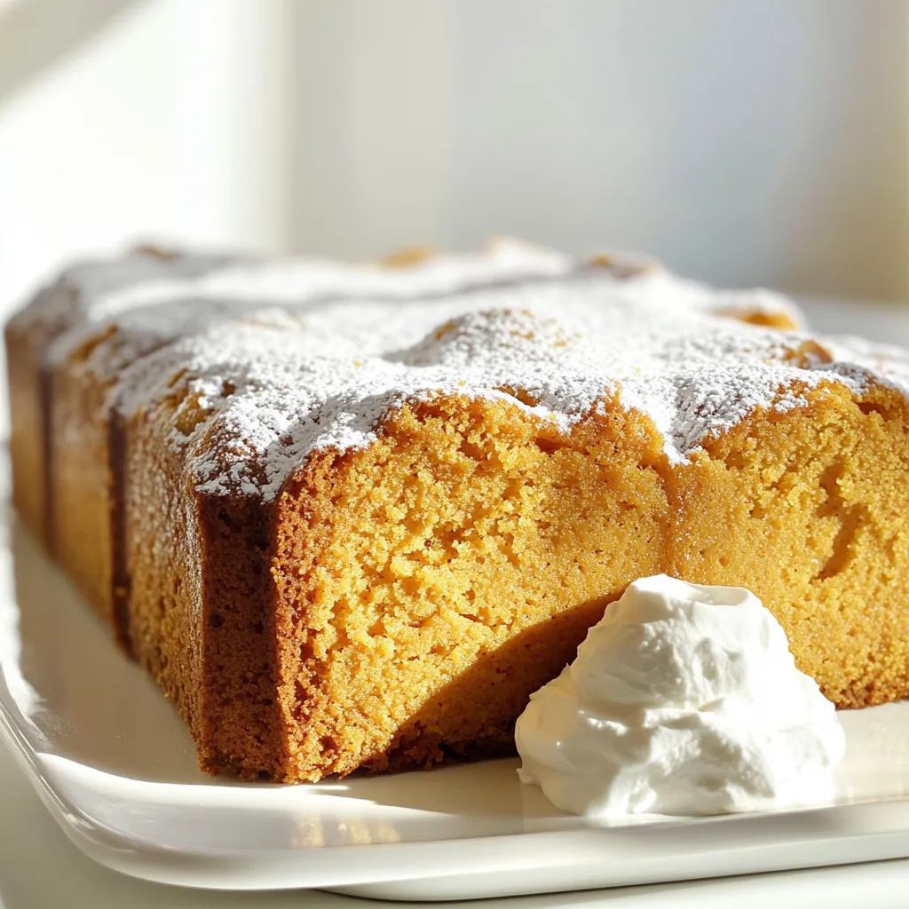 To make this Pumpkin Cream Cheese Pound Cake, gather the following ingredients: - 1 cup pumpkin puree - 8 oz cream cheese, softened - 1 cup granulated sugar - 1 cup brown sugar, packed - 4 large eggs - 1 cup vegetable oil - 2 teaspoons vanilla extract - 3 cups all-purpose flour - 1 tablespoon pumpkin pie spice - 1 teaspoon baking powder - 1/2 teaspoon baking soda - 1/2 teaspoon salt Each ingredient plays a key role. The pumpkin puree gives moisture and flavor. The cream cheese adds richness and creaminess. Both sugars enhance sweetness and help with browning. The eggs bind everything together and add structure. Vegetable oil keeps the cake moist. Vanilla extract adds a warm aroma. The dry ingredients, like flour and spices, provide the cake's texture and taste. Baking powder and baking soda help the cake rise. Salt balances the flavors. By using these simple yet essential ingredients, you can create a cake that is both flavorful and moist. Each bite will have a delightful blend of pumpkin and spice. First, you need to preheat your oven to 350°F (175°C). This step ensures even baking. While the oven heats, grab a 10-inch bundt pan or a loaf pan. Grease the pan well with butter or oil. Then, sprinkle flour in the pan to prevent sticking. Shake out the excess flour. A well-prepped pan is key for a smooth release! In a large mixing bowl, add 8 oz of softened cream cheese. Then, add 1 cup of granulated sugar and 1 cup of packed brown sugar. Beat these together using an electric mixer on medium speed. Mix until the blend is smooth and creamy. This mixture adds richness to the cake. Next, add 1 cup of pumpkin puree to the bowl. Mix until fully combined. Then, crack in 4 large eggs, adding them one at a time. Mix well after each egg. This helps the batter come together nicely. Now, drizzle in 1 cup of vegetable oil and 2 teaspoons of vanilla extract. Continue mixing until everything is blended well. In a separate bowl, whisk together 3 cups of all-purpose flour, 1 tablespoon of pumpkin pie spice, 1 teaspoon of baking powder, 1/2 teaspoon of baking soda, and 1/2 teaspoon of salt. Whisking these dry ingredients evenly distributes the spices and leavening agents. This step is crucial for a uniform flavor in your cake. Now it’s time to combine the wet and dry ingredients. Gradually add the dry mixture to the wet mixture. Mix gently until just combined. Be careful not to overmix, as this can make the cake dense. A few lumps are okay. Overmixing can ruin the fluffy texture you want. Pour the batter into your prepared pan. Use a spatula to smooth the top. Place the pan in the preheated oven. Bake for 60-75 minutes. To check if the cake is done, insert a toothpick into the center. If it comes out clean, your cake is ready. If the top starts browning too quickly, cover it with aluminum foil. After baking, let the cake cool in the pan for 15 minutes. Then, carefully invert it onto a wire rack to cool completely. Enjoy the lovely aroma filling your kitchen! To get the best texture in your pumpkin cream cheese pound cake, avoid overmixing. When you mix the wet and dry ingredients, do it just until they blend. Overmixing makes the cake dense and tough. You want a light and fluffy cake, so mix gently. Next, check for doneness with a toothpick. Stick a toothpick into the center of the cake. If it comes out clean or with a few crumbs, your cake is ready. If it has wet batter on it, bake for a few more minutes. After your cake cools, dust it with powdered sugar. This adds a nice touch and looks great. You can also serve it with whipped cream or a scoop of vanilla ice cream. These toppings make the cake extra special and tasty. If you want to impress your guests, this is an easy way to do it. {{image_2}} You can change the taste of your pumpkin cream cheese pound cake easily. Here are some fun ideas: - Adding nuts or chocolate chips: Chopped walnuts or pecans add crunch. They also pair well with the soft cake. If you like chocolate, try adding semi-sweet chocolate chips. Just fold them in before you pour the batter into the pan. - Using different spices: While pumpkin pie spice is great, you can play with flavors. Try adding cinnamon, nutmeg, or ginger for a unique twist. A little cardamom can also give it a warm kick. If you want a lighter version of this cake, you have options: - Substituting oils or sugars: Instead of vegetable oil, you can use applesauce or Greek yogurt. These swaps cut fat while adding moisture. For sugars, consider using honey or maple syrup. They add sweetness with a hint of flavor. - Gluten-free options: If you need to avoid gluten, use a gluten-free all-purpose flour. Make sure it has xanthan gum to help the cake rise. This way, everyone can enjoy a slice of this delicious cake. Store your Pumpkin Cream Cheese Pound Cake in a cool, dry place. You can keep it at room temperature for up to three days. Wrap it in plastic wrap or place it in an airtight container. This helps keep the cake moist and fresh. If you live in a warm area, the fridge is a better choice. The cool air will help the cake last longer. Just remember, the fridge can dry out baked goods. So, wrap it well! If you want to save some for later, freezing is a great option. First, let the cake cool completely. Then, wrap it tightly in plastic wrap. After that, place it in a freezer bag or container. This helps to keep out air and moisture. Your cake will stay fresh for up to three months in the freezer. When you are ready to enjoy it, take it out and let it thaw in the fridge overnight. You can also leave it at room temperature for a few hours. Once it’s thawed, it will taste just as good as fresh! Yes, you can use fresh pumpkin. First, you need to cook and mash it. Cut the pumpkin into pieces and roast or boil until soft. Once it cools, mash it until smooth. Use this in place of canned pumpkin puree. Just make sure to measure the same amount. The cake stays fresh for about 3 to 5 days. Keep it in an airtight container at