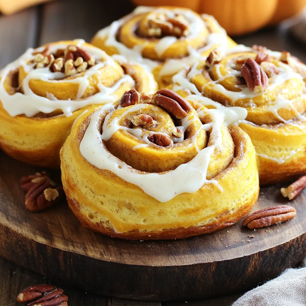 To make pumpkin pecan cinnamon rolls, gather these ingredients: - 2 cups all-purpose flour - 1 ½ teaspoons instant yeast - ½ teaspoon salt - ½ teaspoon ground cinnamon - ¼ cup brown sugar - ½ cup canned pumpkin puree - ¼ cup warm milk - 1 large egg - 3 tablespoons unsalted butter (melted) - ½ cup chopped pecans - ¼ cup granulated sugar - 1 tablespoon ground cinnamon (for filling) - ½ cup cream cheese (softened for frosting) - ½ cup powdered sugar - 1 teaspoon vanilla extract - 2 tablespoons milk (for frosting) You can change this recipe to fit your taste. Here are some ideas: - Use walnuts instead of pecans for a different crunch. - Add a pinch of nutmeg for extra warmth. - Mix in chocolate chips for a sweet twist. - Try maple syrup in the frosting for a unique flavor. This recipe makes 12 rolls. If you want more or fewer, you can adjust: - For 6 rolls, halve all ingredients. - For 24 rolls, double everything. - You can also make mini rolls by cutting smaller pieces. Just watch the bake time! To start, mix the flour, yeast, salt, cinnamon, and brown sugar in a bowl. In another bowl, blend the pumpkin puree, warm milk, egg, and melted butter. Now, pour the wet mix into the dry mix. Stir until a dough forms. This dough will be soft and a bit sticky. Next, place the dough on a floured surface. Knead it for about five minutes. You want it smooth and elastic. Once done, place it in a greased bowl, cover it with a towel, and let it rise in a warm area for one hour. The dough should double in size. For the filling, mix the granulated sugar and ground cinnamon in a small bowl. This mix will add sweetness and spice to the rolls. Set aside for later use. After the dough rises, punch it down gently. Move it to a floured surface. Roll it out into a rectangle, about 12 by 18 inches. Make sure it’s even and flat for the best results. Spread the cinnamon-sugar mixture evenly over the dough. Then, sprinkle the chopped pecans on top. Starting from one long side, roll the dough tightly into a log. Once rolled, slice it into 12 equal pieces. Place them cut-side up in a greased baking dish. Leave space between each roll for them to grow. Preheat your oven to 350°F (175°C). Let the rolls rise again, covered, for about 30 minutes. Once they are fluffy, bake them for 20 to 25 minutes. They should turn golden brown and smell amazing. While the rolls bake, make the frosting. In a mixing bowl, beat together the cream cheese, powdered sugar, vanilla extract, and milk. Blend until smooth and creamy. After the rolls cool for a few minutes, spread the frosting generously on top. Enjoy your delicious pumpkin pecan cinnamon rolls! For the best results, keep the dough warm. A warm spot helps the yeast work better. I like to place my bowl in a sunny area, or near a warm oven. Cover the bowl with a clean towel. This keeps the dough cozy and moist. Let it rise until it doubles in size, which usually takes about one hour. Patience is key here. When rolling the dough, aim for a nice rectangle. About 12 by 18 inches works well. Use a gentle touch. Start at one long side and roll tightly. This helps keep the filling inside. After rolling, slice the dough into equal pieces. A sharp knife or dental floss works best. Place the rolls cut-side up in the greased dish with some space between them. For creamy frosting, beat the cream cheese until smooth. Then add powdered sugar, milk, and vanilla extract. Mix until it’s nice and fluffy. If the frosting is too thick, add a bit more milk. If it’s too thin, add more powdered sugar. This way, you can find the perfect balance. I love to add a hint of cinnamon to the frosting for extra flavor. {{image_2}} You can change the taste of your pumpkin pecan cinnamon rolls by using different nuts or spices. Try walnuts for a richer flavor. Hazelnuts add a nice crunch too. If you like warmth, add nutmeg or ginger for a cozy twist. You can even mix in chocolate chips for a sweet surprise. Just remember, keep the ratios similar to maintain the roll's structure. To make these rolls vegan, switch a few ingredients. Use almond milk or soy milk instead of regular milk. Replace the egg with a flax egg. Just mix one tablespoon of ground flaxseed with three tablespoons of water and let it sit for five minutes. For butter, use coconut oil or vegan butter. These swaps keep the rolls soft and delicious without animal products. If you need a gluten-free option, use a gluten-free flour blend. Look for one that has xanthan gum, as it helps with texture. You might need to adjust the liquid amounts. Start with less milk and add as needed. This way, you keep the dough from getting too sticky. Your rolls will still puff up nicely, and they will taste great. To keep your pumpkin pecan cinnamon rolls fresh, store them in an airtight container. Make sure they cool down completely before sealing. They will last for up to three days at room temperature. If you want them to last longer, consider refrigeration. In the fridge, they can stay good for about a week. When you want to enjoy these rolls again, reheating is simple. Place a roll on a microwave-safe plate. Cover it loosely with a damp paper towel. Heat for about 15-20 seconds. Check if it’s warm enough. If not, add a few more seconds. You can also reheat them in an oven. Preheat the oven to 350°F (175°C). Place the rolls on a baking sheet and heat for about 10 minutes. This method keeps them soft and delicious. Freezing your pumpkin pecan cinnamon rolls is a great way to save some for later. Once they cool completely, wrap each roll tightly in plastic wrap. Then, place them in a freezer bag or container. They can stay frozen for about three months. When you’re ready to enjoy, thaw them overnight in the fridge. Reheat as mentioned before for the best taste. Yes, you can use fresh pumpkin. Cook and puree it first. Make sure to drain extra water. This keeps your rolls from getting soggy. Fresh pumpkin adds a nice taste. If your dough feels dry, a