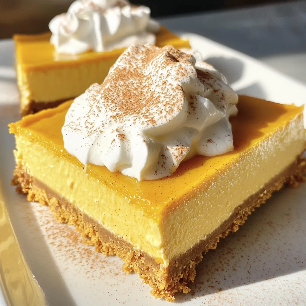 Serve these cheesecake bars with a warm drink. A pumpkin spice latte pairs perfectly. You can also enjoy them with hot chocolate or coffee. Add a dollop of whipped cream on top for a delicious touch. Ground cinnamon makes a lovely garnish too!