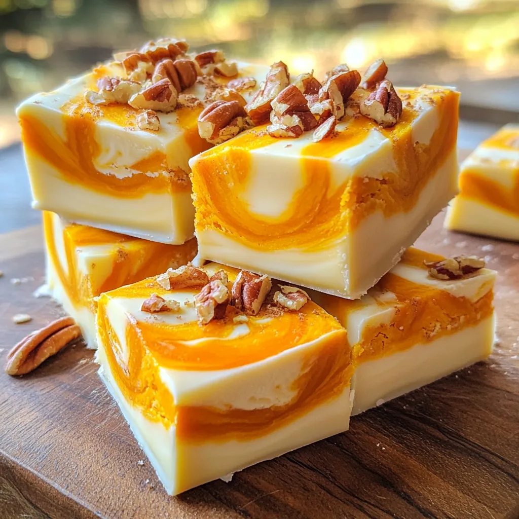 Pour the remaining white chocolate mixture on top of the pumpkin layer. Smooth it out with a spatula. You can swirl again if you want a more intense marbling. If you like, sprinkle chopped pecans on top for added crunch. Now, refrigerate the fudge for at least 2-3 hours. Once firm, lift the fudge out using the parchment overhang. Place it on a cutting board and cut it into squares. Enjoy your delicious treat!