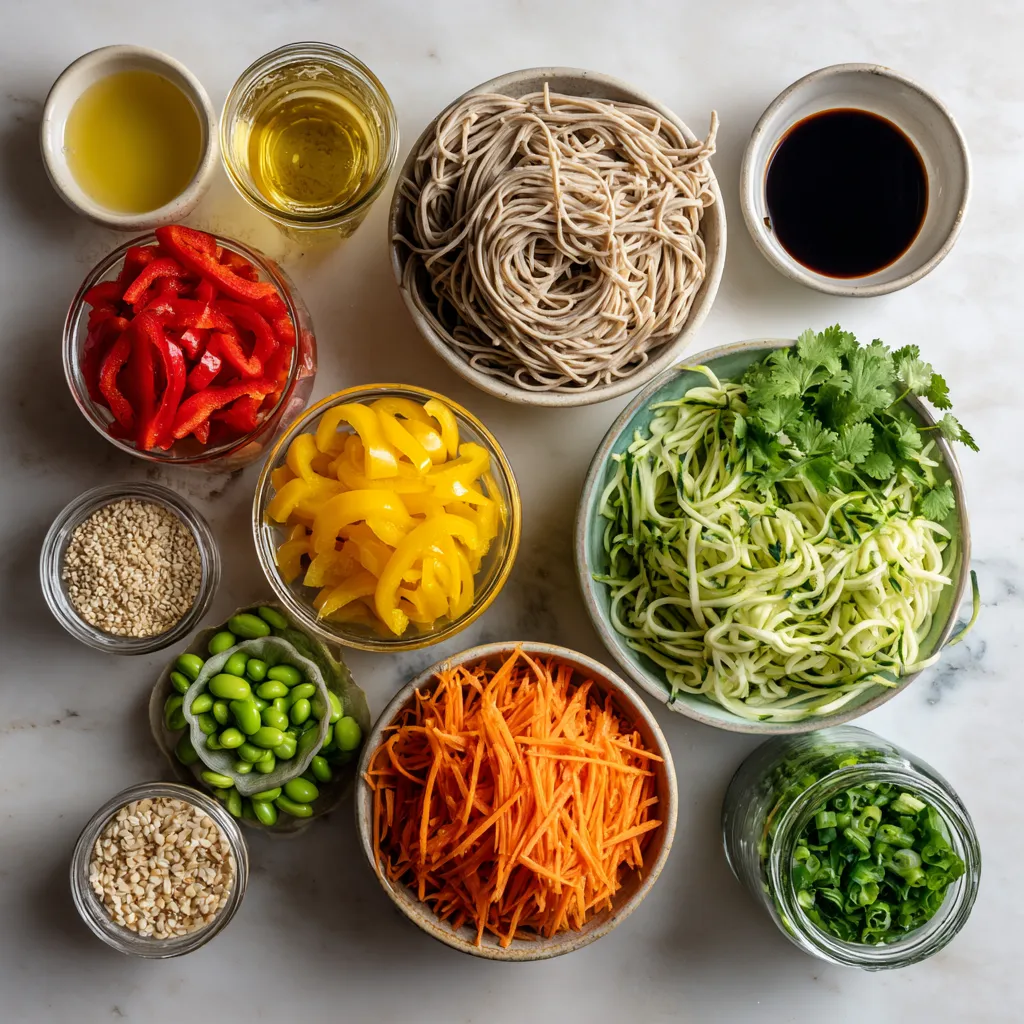 In this salad, soba noodles are the star. They are nutty and chewy. You can also use rice or wheat noodles if you prefer. The colorful bell pepper adds a nice crunch. Shredded carrots and cucumber give a fresh taste. Edamame packs in protein, making this salad filling. Green onions and cilantro add a burst of flavor.