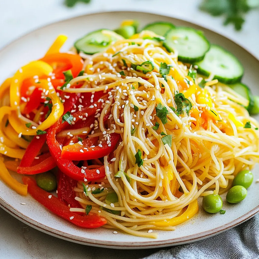- In a large mixing bowl, combine the cooked noodles, bell pepper, shredded carrots, cucumber, edamame, green onions, and cilantro.