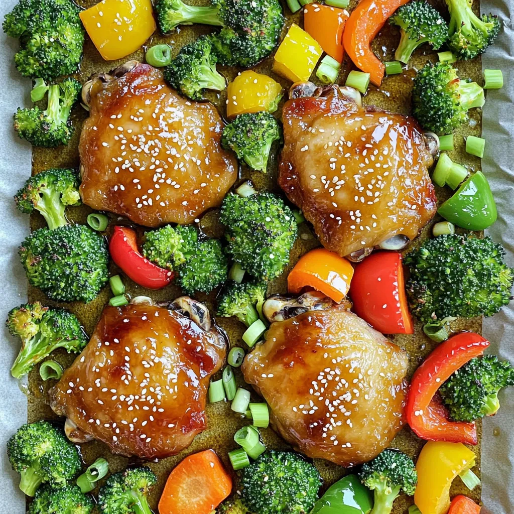 - 4 bone-in, skin-on chicken thighs - 1/4 cup honey - 4 cloves garlic, minced - 2 tablespoons soy sauce (low sodium) - 1 tablespoon apple cider vinegar - 1 teaspoon fresh ginger, grated - 1 teaspoon sesame oil - 1 teaspoon black pepper - 1 teaspoon salt - 1 cup broccoli florets - 1 cup bell peppers, sliced (any color) - 1 cup baby carrots - Sesame seeds and sliced green onions for garnish Each serving contains roughly: - Calories: 350 - Protein: 25g - Fat: 20g - Carbohydrates: 20g - Fiber: 3g - Sugar: 10g This meal packs a good balance of protein and veggies. It gives you energy without too many carbs. Using fresh ingredients makes a big difference. Fresh garlic has a strong flavor. It adds depth to the dish. Fresh ginger gives a nice zing, too. Dried ingredients can work in a pinch. But they might lack the vibrant taste you want. If you have fresh garlic or ginger, use them! For vegetables, fresh broccoli, bell peppers, and carrots provide crunch and color. Frozen veggies can substitute but may not taste as fresh. Always choose what makes your meal best! Start by gathering your ingredients. You'll need: - 4 bone-in, skin-on chicken thighs - 1/4 cup honey - 4 cloves garlic, minced - 2 tablespoons low sodium soy sauce - 1 tablespoon apple cider vinegar - 1 teaspoon fresh ginger, grated - 1 teaspoon sesame oil - 1 teaspoon black pepper - 1 teaspoon salt - 1 cup broccoli florets - 1 cup sliced bell peppers - 1 cup baby carrots - Sesame seeds and sliced green onions for garnish Next, preheat your oven to 425°F (220°C). This step is key for crispy skin. Line a large baking sheet with parchment paper. This makes cleanup easy. In a medium bowl, mix together honey, minced garlic, soy sauce, apple cider vinegar, ginger, sesame oil, black pepper, and salt. Whisk until smooth. Place the chicken thighs on the baking sheet, skin-side up. Pour half of the honey garlic mixture over the chicken. Use a brush for an even coat. In another bowl, toss the broccoli, bell peppers, and carrots with the remaining sauce. Spread the veggies around the chicken on the baking sheet. Bake for 30 to 35 minutes. The chicken should reach an internal temperature of 165°F (74°C). The skin should look golden and crispy. Stir the veggies halfway through cooking for even results. Once done, take the chicken out of the oven. Let it rest for 5 minutes. This step keeps the chicken juicy. Serve hot and top with sesame seeds and green onions for extra flavor. To check if your chicken is done, use a meat thermometer. Insert it into the thickest part of the thigh but avoid the bone. If it reads 165°F (74°C), it's ready. If you don’t have a thermometer, check if the juices run clear. If they are pink, it needs more time. Always ensure your chicken is fully cooked for safety. To get crispy chicken skin, start with bone-in, skin-on thighs. Pat the skin dry with paper towels. This helps to remove moisture. Moisture makes skin soggy. Then, use the honey garlic sauce on the chicken. The sugar in honey helps crisp the skin when baking. Bake at a high heat of 425°F (220°C) for the best results. This method works wonders for a golden finish. For the best flavor, marinate the chicken for at least 30 minutes. If you have more time, let it sit for up to 4 hours. Longer marinating adds depth to the taste. You can even marinate it overnight in the fridge. Just remember to cover it well. This helps keep the chicken fresh and tasty. Use a large baking sheet lined with parchment paper. This makes cleanup easy. A rimmed sheet helps prevent juices from spilling out. If you have a meat thermometer, use it. It shows when the chicken reaches 165°F (74°C). This ensures your chicken is safe to eat. A good quality whisk helps mix the sauce well. These tools make cooking simpler and more fun. {{image_2}} You can easily swap chicken thighs for chicken breasts. Breasts are leaner and cook faster. Just check them often to avoid drying out. For a plant-based option, use tofu. Press the tofu to remove excess water. Cut it into cubes and marinate it like chicken. Bake until golden for a tasty alternative. Feel free to mix up the veggies. Zucchini, asparagus, or snap peas work well. You can also add sweet potatoes for a hearty touch. Aim for a mix of colors and textures. This keeps the dish exciting and healthy. Just remember to cut everything into similar sizes for even cooking. To switch things up, add spices to your honey garlic mix. Paprika gives a smoky kick. Or try chili flakes for some heat. A splash of lemon juice can brighten the dish. You can even add fresh herbs like basil or cilantro. Each change adds a new layer of flavor that makes the meal special. To store your leftovers, let the chicken cool down. Place it in an airtight container. Add any veggies you have left too. Keep it in the fridge for up to 3 days. This keeps the dish fresh and tasty for your next meal. To reheat, preheat your oven to 350°F (175°C). Transfer the chicken and veggies to a baking dish. Cover it with foil to keep the moisture in. Heat for about 15 to 20 minutes. You want it warm and juicy, just like when you first made it. If you want to freeze your leftovers, wrap them tightly. Use freezer-safe bags or containers. This way, you can enjoy them later. Make sure to use them within 3 months for best taste. To thaw, move them to the fridge overnight before reheating. This keeps the chicken and veggies safe and delicious. Yes, you can use boneless chicken thighs. They will cook faster than bone-in thighs. Adjust your cooking time to about 20-25 minutes. Always check the internal temperature. The meat should reach 165°F (74°C) for safety. You can serve many sides with this dish. Here are some great options: - Steamed rice or quinoa - Mashed potatoes or sweet potatoes - A fresh green salad - Roasted vegetables or a vegetable stir-fry These sides balance the sweet and savory flavors of the chicken. It typically takes 30-35 minutes for bone-in chicken thighs. Always prehe