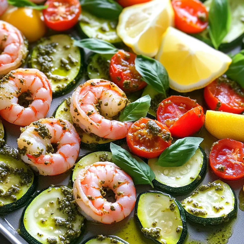- 1 pound large shrimp, peeled and deveined - 2 medium zucchinis, sliced into half-moons - 1 bell pepper (any color), sliced - 1 cup cherry tomatoes, halved - 1/4 cup pesto (store-bought or homemade) - 3 tablespoons olive oil - 2 cloves garlic, minced - Salt and pepper to taste - Fresh basil leaves for garnish - Lemon wedges for serving This dish shines with fresh, vibrant flavors. The shrimp offer a nice, sweet taste. Zucchini adds crunch and helps create a well-rounded meal. You can pick any color of bell pepper for a pop of color. Cherry tomatoes add juiciness and a slight tang. I recommend using fresh pesto for the best taste. It blends well with the olive oil and garlic. The garlic adds a warm, savory note that enhances the shrimp. Don’t forget to season with salt and pepper. This step is key to bringing the flavors together. Finally, fresh basil and lemon wedges elevate the dish. They add a burst of freshness right before serving. With these simple ingredients, you create a tasty, fresh meal that’s quick and easy. 1. Preheat your oven to 400°F (200°C). This step is key for even cooking. 2. In a large mixing bowl, combine the shrimp, zucchini, bell pepper, cherry tomatoes, minced garlic, olive oil, and pesto. Toss everything gently until well coated. This ensures every piece gets flavor. 1. Spread the mixture evenly on a large baking sheet lined with parchment paper. This helps with easy cleanup and prevents sticking. 2. Season the shrimp and vegetables with salt and pepper to taste. This simple step boosts the dish's flavor. 3. Bake in the preheated oven for 12-15 minutes. Look for the shrimp to turn pink and the veggies to soften. This means they are ready to serve. 1. Once done, remove the pan from the oven and let it cool for a couple of minutes. This helps avoid burns. 2. Garnish with fresh basil leaves. They add a fresh touch and great color. 3. Serve hot with lemon wedges on the side. A squeeze of lemon gives a bright, fresh flavor. - Use fresh ingredients for best flavor. Fresh shrimp and veggies really shine in this dish. They add a bright taste that frozen or canned items can't match. Pick vibrant zucchinis and ripe tomatoes. Fresh basil gives the best aroma and taste. - Don’t overcook the shrimp. Shrimp cook fast. If you leave them in too long, they turn tough. Watch for them to turn pink and curl slightly. This means they are done. Remove the dish from the oven quickly to keep them juicy. - Pair with rice or quinoa for a complete meal. This dish works well on its own, but a grain adds texture. The rice or quinoa soaks up the lovely pesto sauce. This makes each bite even better. - Ideal for meal prep or quick weeknight dinners. You can easily make this recipe in advance. Store it in the fridge for up to three days. It’s perfect for busy nights when you need a quick meal. Just reheat and enjoy! - Homemade vs store-bought pesto. Homemade pesto is fresh and can be customized. Store-bought is quick and still tasty. Both options work well, but homemade gives you control over flavors and ingredients. - Using different herb blends for variation. You can switch up the herbs in your pesto. Try using spinach, arugula, or even cilantro. Each choice adds a unique twist to the dish. Get creative and find your favorite mix! {{image_2}} You can change up the veggies in this dish. Try adding asparagus or broccoli. Both add crunch and a fresh taste. Using different colors of bell pepper also makes the dish pop. Red, yellow, or green all work well and change the flavor. If you want a different protein, you have choices. Swap shrimp for chicken or tofu for a hearty meal. Chicken thighs or breasts cook well with the same method. For a gourmet twist, use scallops. They cook quickly and add a rich flavor. To boost the flavor, add lemon zest. It makes the dish bright and fresh. Crushed red pepper flakes can add heat. You can also try different spices like paprika or oregano. Experimenting with spices keeps the meal exciting and new. To store your leftover sheet pan pesto shrimp and zucchini, follow these simple steps: - Place the cooled dish in an airtight container. - Store it in the fridge for up to three days. - If you want to freeze it, use a freezer-safe container or bag. - Make sure to remove as much air as possible before sealing. When it’s time to enjoy your leftovers, here are some great methods for reheating: - Oven: Preheat your oven to 350°F (175°C). Place the shrimp and zucchini on a baking sheet. Heat for about 10 minutes or until warm. This keeps the shrimp tender. - Microwave: Use a microwave-safe dish. Cover it with a lid or microwave-safe wrap. Heat in 30-second intervals, stirring in between, until warm. This method is quick but may make the shrimp slightly less tender. Knowing how long your dish lasts is key for food safety: - In the fridge, your dish lasts about 3 days. - In the freezer, it can last up to three months. - Always look for signs that it should be discarded. If the shrimp smells off or the vegetables look slimy, it’s best to toss it. Yes, you can prep this dish in advance. To do this, follow these steps: - Chop the veggies: Slice the zucchinis and bell peppers a day before. - Clean the shrimp: Peel and devein the shrimp ahead of time. - Mix ingredients: Combine shrimp, vegetables, garlic, pesto, and olive oil. Store in the fridge in an airtight container. - Bake later: When ready, simply spread the mixture on a baking sheet and bake as directed. This way, you save time on busy days. If you want to change up the protein, here are some great options: - Chicken: Cut chicken breast into bite-sized pieces. Cook until fully done. - Tofu: Use firm tofu. Press it to remove excess water and cut into cubes. - Scallops: These will give a fancy twist. Sauté briefly before adding to the sheet pan. These swaps cater to different dietary needs while keeping the dish tasty. Yes, this dish is gluten-free! All the ingredients listed do not contain gluten. If you