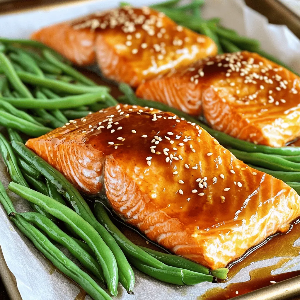 For assembly, place the salmon fillets on one side of the sheet pan. Brush the teriyaki mixture generously over the salmon. On the other side, add the green beans. Drizzle a little olive oil on them and season with salt and pepper. Toss the green beans to coat them evenly.