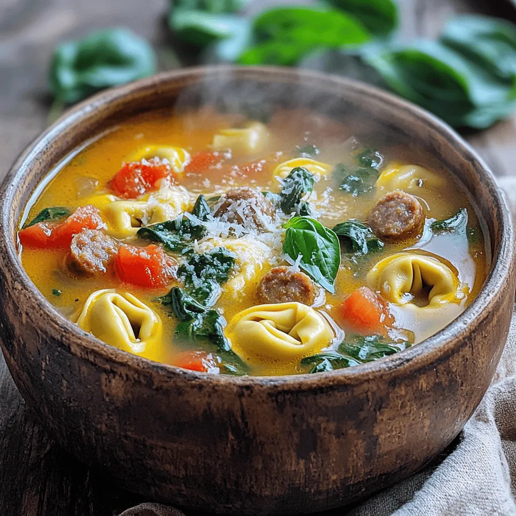 To make this soup, start by cooking 1 pound of Italian sausage in a skillet. Brown it well and then drain any fat. Next, transfer the sausage to your slow cooker. Add 1 diced onion and 3 minced garlic cloves. Pour in 4 cups of low-sodium chicken broth and 2 cups of diced tomatoes. Mix in 1 teaspoon of Italian seasoning, salt, and pepper to taste. Cook on low for 6-7 hours or high for 3-4 hours. About 30 minutes before serving, stir in 1 cup of heavy cream, 2 cups of fresh spinach, and 1 package of refrigerated cheese tortellini. Cook for another 30 minutes until the tortellini are tender.