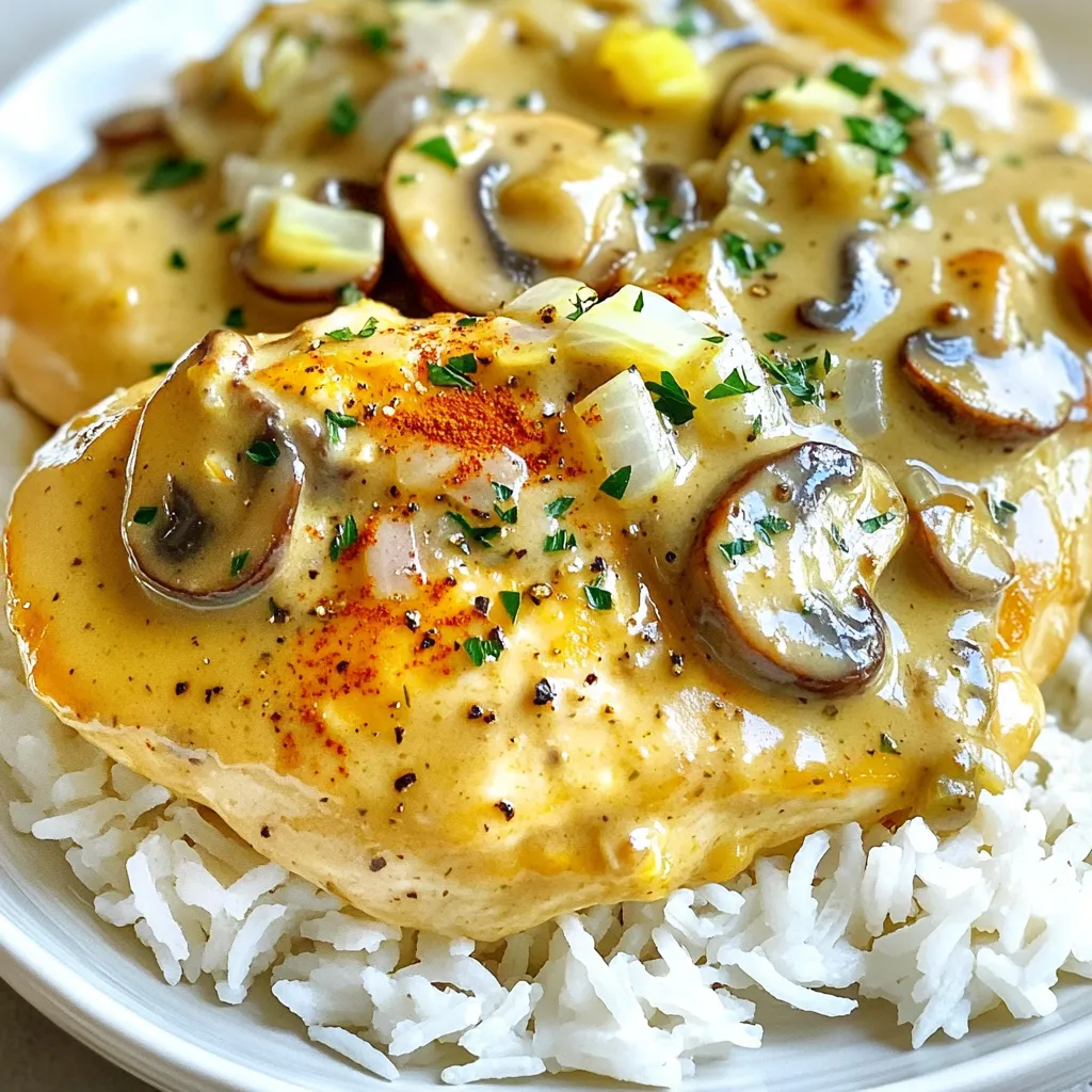 7. Garnish and Serve: Serve the creamy mushroom chicken over rice or mashed potatoes, drizzling extra sauce on top. Finish with freshly chopped parsley for a bright touch.