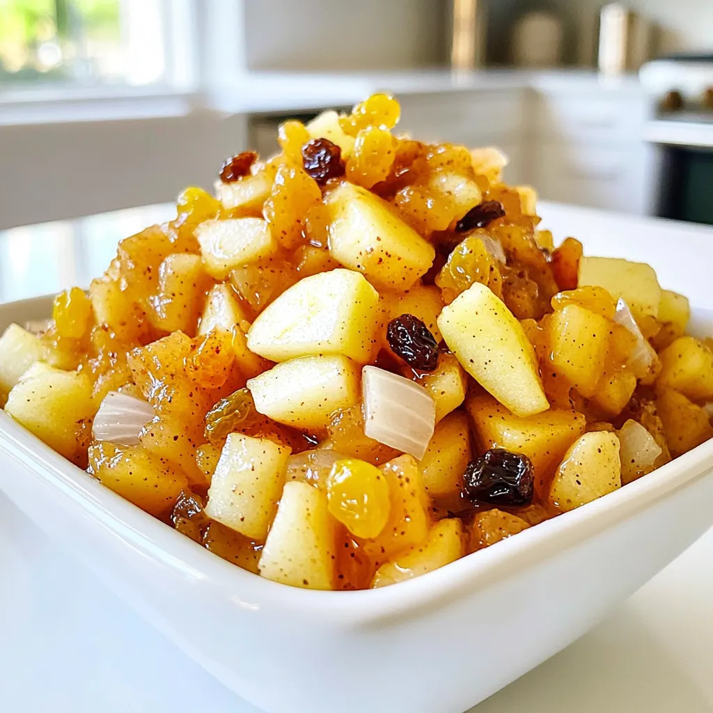In a large bowl, combine the diced apples, chopped onion, brown sugar, apple cider vinegar, and raisins. Mix them well, and make sure the apples are coated. This step helps build flavor.