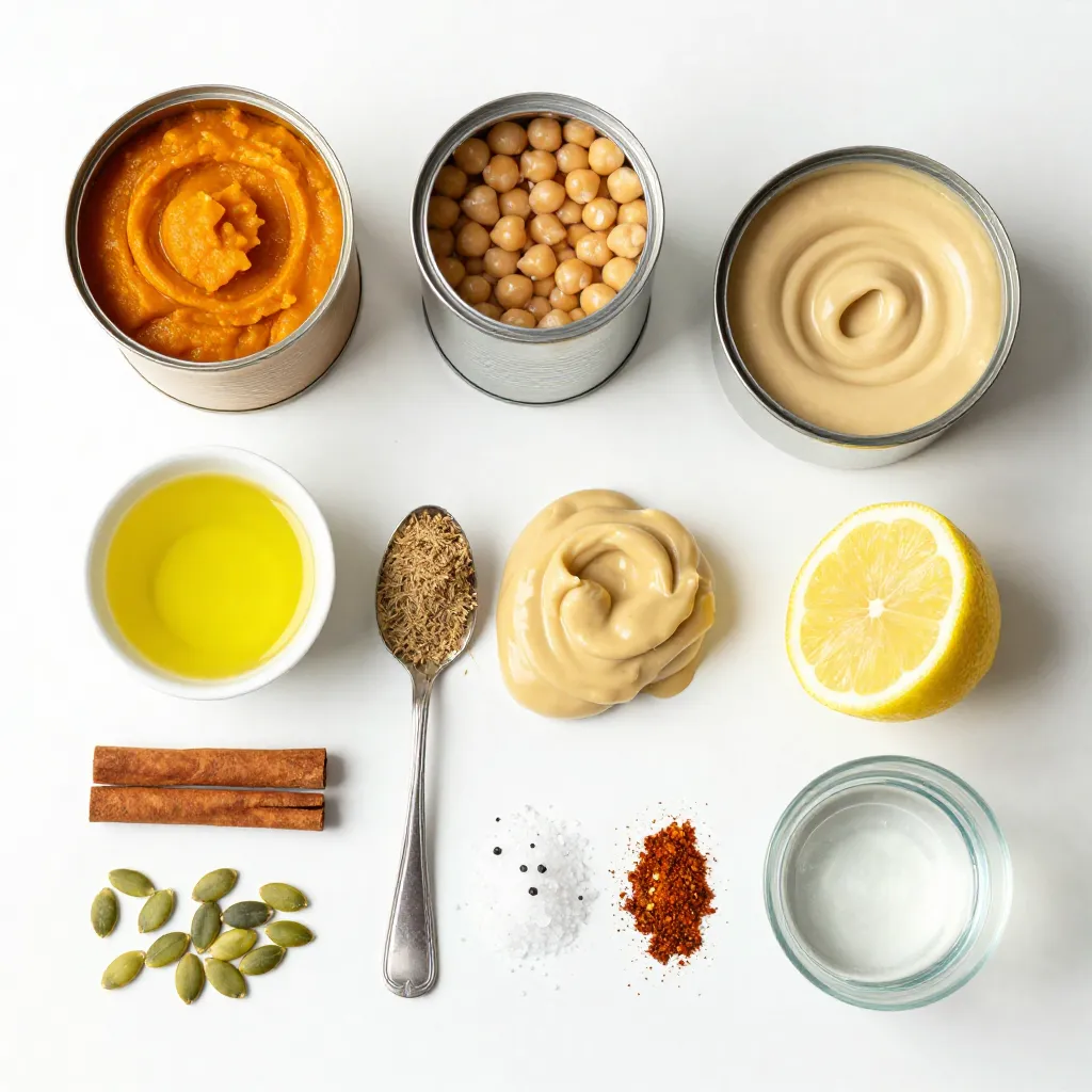 The main ingredients for spiced pumpkin hummus create a smooth and creamy base. Canned pumpkin puree adds a rich flavor. Chickpeas provide protein and a nice texture. Tahini brings a nutty taste that complements the pumpkin. Olive oil adds a silky finish. Lemon juice helps to brighten up the flavors.