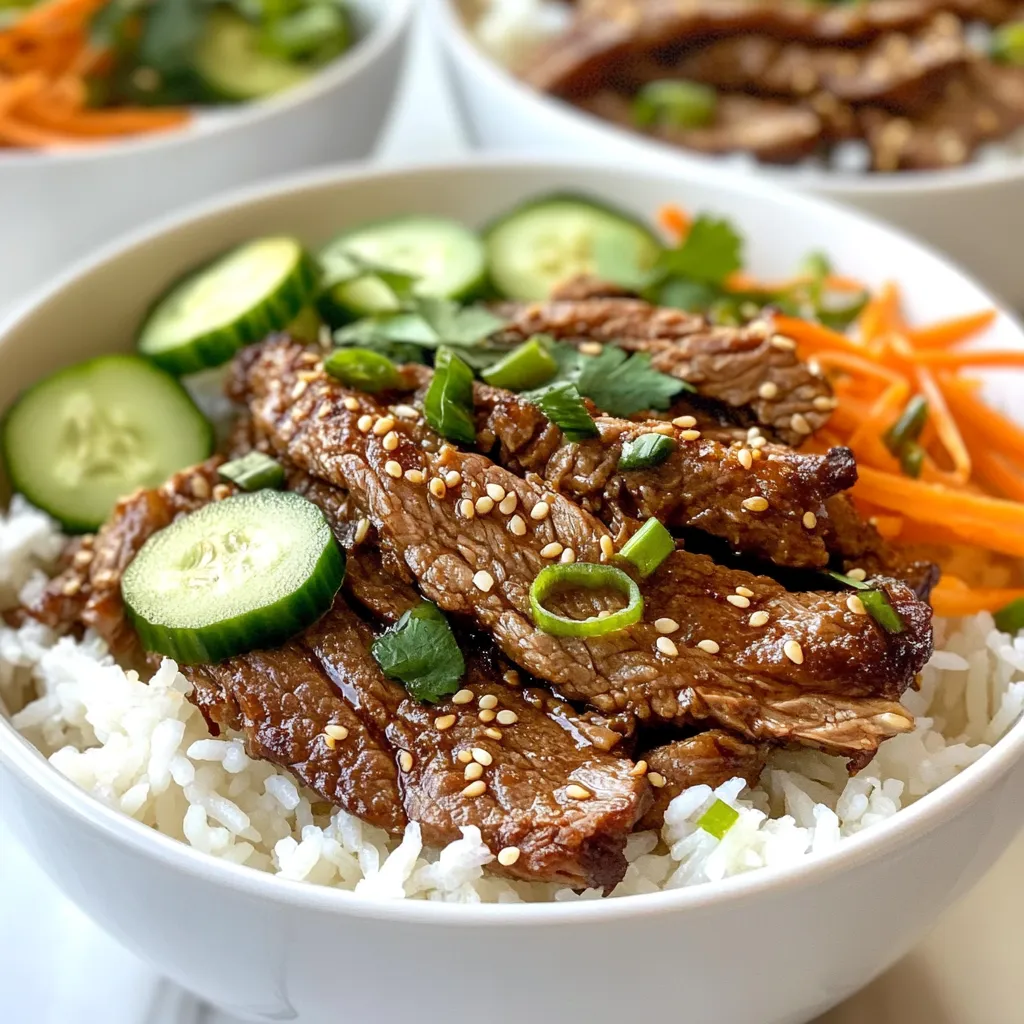 Now comes the fun part! Start with cooked jasmine rice in each bowl. This rice will soak up all the tasty juices. Next, add the cooked bulgogi beef on top. Then, sprinkle shredded carrots and sliced cucumber for crunch. For the final touch, garnish with sliced green onions, sesame seeds, and fresh cilantro. This makes your bowls look colorful and appetizing!