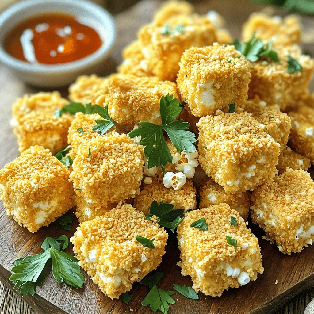 ![- 1 block (14 oz) firm tofu - 1 cup popcorn kernels - 1 tablespoon cornstarch - 1 teaspoon paprika - 1 teaspoon garlic powder - 1 teaspoon onion powder - 1 teaspoon cayenne pepper - 1 teaspoon salt - 1 tablespoon soy sauce - 1 teaspoon sesame oil - 1 cup breadcrumbs (panko recommended) - Oil for frying - Kitchen tools needed (heavy object for pressing, mixing bowls, frying pan) Gather these fresh ingredients first. You want firm tofu for the best texture. I like to use panko breadcrumbs for extra crunch. The spices pack a punch, so feel free to adjust the cayenne pepper for your taste. Make sure you have oil ready for frying. A deep skillet or frying pan works well. You will need a heavy object to press the tofu. This step helps remove moisture and makes the tofu crispy. Check the Full Recipe for detailed steps and cooking times. It's all about getting that perfect crunch while keeping the inside soft and flavorful. Enjoy the process! Start by pressing the tofu. Wrap the tofu block in a clean towel. Place a heavy object on top. This helps remove excess moisture for about 30 minutes. After pressing, cut the tofu into bite-sized cubes. Aim for pieces that are uniform in size. This ensures even cooking. Next, combine the dry ingredients for seasoning. In a large mixing bowl, mix cornstarch, paprika, garlic powder, onion powder, cayenne pepper, and salt. Stir well to create a spice mix. Now, marinate the tofu cubes. Drizzle soy sauce and sesame oil over the cubes. Toss gently to coat evenly. Add the spice mix and ensure each cube is well-seasoned. Let it marinate for about 15 minutes. While the tofu marinates, it’s time to pop the popcorn. You can use an air popper or stovetop method. Both work well. Once popped, let the popcorn cool for a bit. Place it in a large mixing bowl. This will be mixed with the tofu nuggets later. Now, preheat oil in a deep skillet or frying pan over medium heat. You need about an inch of oil for frying. Take each marinated tofu cube. Roll it in breadcrumbs to coat fully. Carefully place the coated cubes into the hot oil. Fry in batches to avoid overcrowding. Cook until golden brown and crispy, about 4-5 minutes per batch. Use a slotted spoon to transfer them to a paper towel-lined plate. This absorbs excess oil. Finally, take the lightly crushed popcorn and mix it with the fried tofu nuggets in a bowl. The popcorn adds great texture and flavor! For the complete process, refer to the Full Recipe. To boost the flavor of your spicy popcorn tofu nuggets, try adding smoked paprika. This spice gives a deep, smoky taste. You can also mix in other spices like cumin or chili powder. If you want a healthier frying option, consider using an air fryer. You can achieve a crispy texture with less oil. It’s a win-win for your taste buds and health! Proper breading is key for the best texture. Make sure each tofu cube is fully coated in breadcrumbs. This will give you that nice crunch. The oil temperature matters too. Heat the oil to about 350°F. This prevents the nuggets from soaking up too much oil and becoming soggy. Fry in small batches to keep the temperature steady and ensure even cooking. Garnish your nuggets with fresh herbs like parsley or cilantro. This adds a pop of color and freshness! For dipping, serve them with sauces like sriracha or sweet chili. These sauces enhance the flavor and add a spicy kick. You can also try mixing your popcorn with some of the dipping sauce for an extra treat. For the complete recipe, check out the [Full Recipe]. {{image_2}} You can switch up your coating for a new texture. Try using crushed nuts or seeds instead of breadcrumbs. This adds a nice crunch and flavor. Almonds or sunflower seeds work well. You can also use vegan cheese for added taste. Sprinkle some shredded cheese on the tofu before frying for a cheesy twist. Adjust the spice levels to suit your taste. If you want milder nuggets, use less cayenne pepper. This makes it friendly for kids or those who dislike heat. You can also play with different marinades or sauces. Try teriyaki or barbecue sauce instead of soy sauce. Each choice will change the flavor and excitement of the dish. You don't have to fry these nuggets. Baking is a healthy option that still gives a tasty result. To bake, preheat your oven to 400°F (200°C). Place the coated nuggets on a baking sheet and bake for 20-25 minutes, flipping halfway through. You can also use an air fryer. This method gives a crispy texture without much oil. Just set your air fryer to 375°F (190°C) and cook for about 15 minutes. Enjoy your crispy nuggets with less guilt! To keep your spicy popcorn tofu nuggets fresh, place them in an airtight container. This method prevents moisture from making them soggy. Store them in the fridge for up to three days. After three days, they may lose their crispiness and flavor. For reheating, the oven works best. Preheat it to 350°F (175°C). Place the nuggets on a baking sheet and heat for about 10-15 minutes. This method helps them stay crispy. If you use a microwave, the nuggets may become soft. If you must use a microwave, heat them in short bursts. This will help keep some of their crunch. Enjoy them warm, and they will taste great! You can use softer tofu, but it changes the texture. Firm tofu holds its shape well during cooking. Soft tofu can break apart easily. It may also absorb more sauce. This might make your nuggets less crispy. For best results, stick with firm tofu. Yes, you can easily make this recipe gluten-free. Use tamari instead of soy sauce. For breadcrumbs, look for gluten-free varieties. You can also crush gluten-free crackers as a substitute. These swaps keep the flavor while making it safe for gluten-free diets. To add more heat, try using different spices. Add chili powder or crushed red pepper flakes. You can also mix in hot sauce with the marinade. If you like it really spicy, add more cayenne pepper. Just taste as you go to find your perfect heat level. Yes, you ca