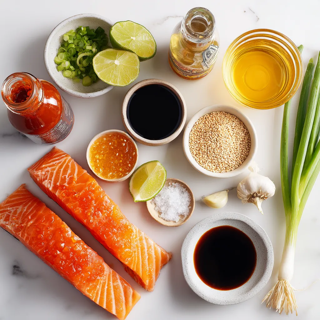 For this Sriracha honey glazed salmon, I use fresh ingredients for the best taste. Salmon fillets make a fantastic base. Choose fillets around 6 ounces each. Honey adds sweetness, while Sriracha gives it a spicy kick. Low-sodium soy sauce brings umami flavor without too much salt. Fresh lime juice brightens everything up. Minced garlic adds depth, and sesame oil brings richness.