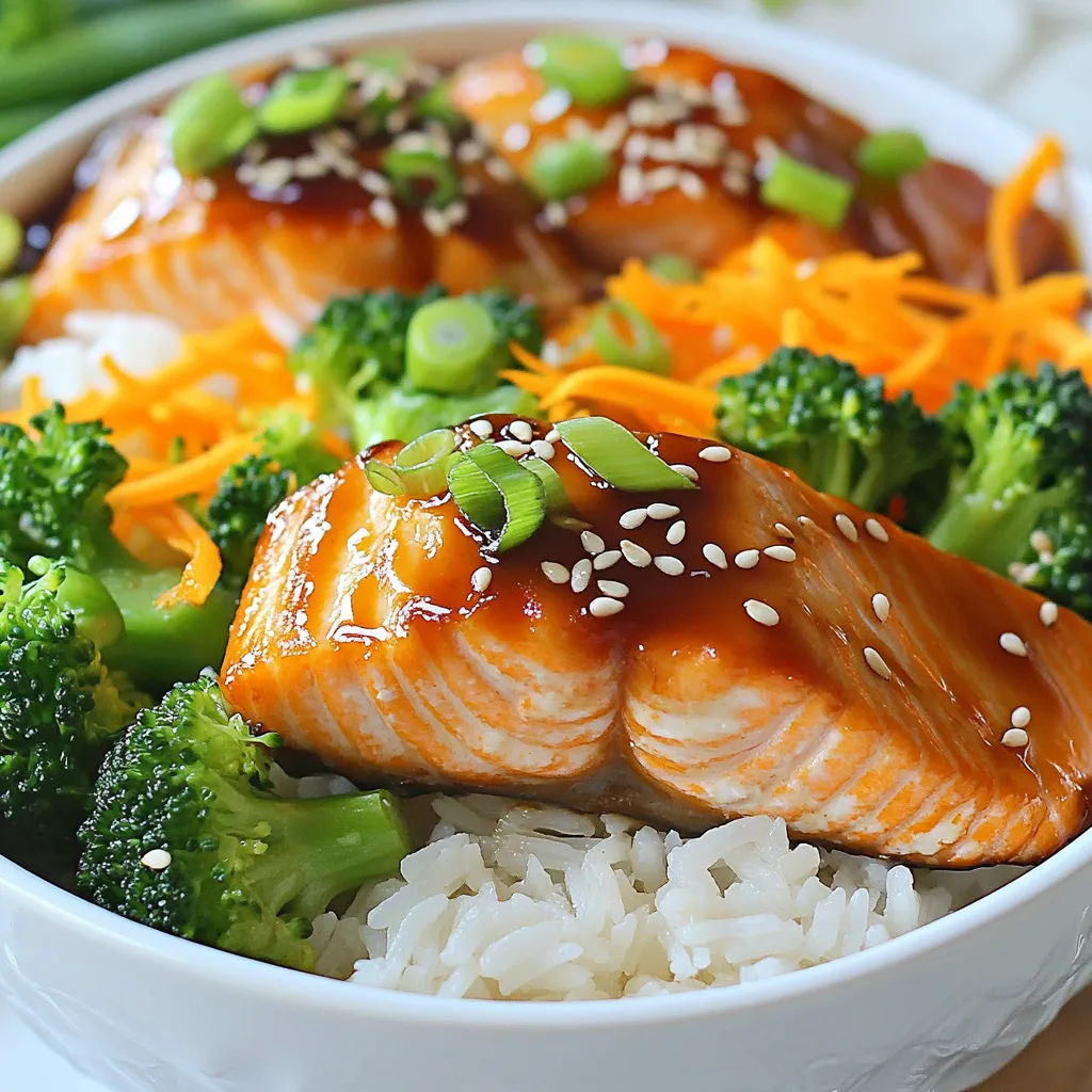 - 2 salmon fillets (about 6 oz each) - 1/4 cup low sodium soy sauce - 2 tablespoons honey - 1 tablespoon rice vinegar - 1 tablespoon sesame oil - 2 teaspoons fresh ginger, grated - 1 cup steamed broccoli florets - 1/2 cup shredded carrots - 1/4 cup chopped green onions - 1 tablespoon sesame seeds (for garnish) Gather these ingredients for a tasty, easy meal. Fresh salmon gives a rich flavor. Low sodium soy sauce keeps the salt down. Honey adds a nice sweetness to the dish. Rice vinegar adds a little tang. Sesame oil gives it a unique taste. Grated ginger adds warmth and spice. For the veggies, steamed broccoli adds crunch and color. Shredded carrots bring sweetness and brightness. Green onions offer a fresh bite. Finally, sesame seeds make the dish look great and add a nice crunch. Together, these ingredients create a balanced and healthy meal. You will enjoy every bite of your teriyaki salmon rice bowl! {{ingredient_image_1}} Whisk together these ingredients to make your teriyaki marinade: - 1/4 cup low sodium soy sauce - 2 tablespoons honey - 1 tablespoon rice vinegar - 1 tablespoon sesame oil - 2 teaspoons fresh ginger, grated - 1 garlic clove, minced Mix them until smooth. The blend of flavors will add a sweet and salty taste to your salmon. Place your salmon fillets in a shallow dish. Pour half of the marinade over them. Make sure they are well coated. Let the salmon marinate for at least 20 minutes. This step is key for flavor. Preheat your oven to 400°F (200°C). Line a baking sheet with parchment paper. Place the marinated salmon fillets on the baking sheet. Bake for 15-20 minutes. Look for the salmon to be cooked through and flake easily with a fork. If your jasmine rice is not cooked yet, now is the time to cook it. Fluff the cooked rice with a fork and set it aside. While the salmon bakes, steam your broccoli florets and shred your carrots. These veggies add color and crunch. Divide the rice into two bowls. Top each bowl with a salmon fillet, steamed broccoli, and shredded carrots. Drizzle the remaining marinade over everything. Season with salt and pepper to taste. Finally, sprinkle chopped green onions and sesame seeds on top for garnish. Enjoy your meal! To get the best teriyaki sauce, you can adjust the honey for sweetness. If you like it sweeter, add more honey. For a less sweet taste, use less. You can also try other marinades, like soy-garlic or a spicy blend. Mixing flavors can make a unique sauce that fits your taste. When cooking salmon, you can choose between broiling or baking. Broiling cooks it faster and gives a nice crust. Baking is great for a tender result. Both methods work well, so pick what you like best. For veggies, you can steam or stir-fry them. Steaming keeps them bright and tender, while stir-frying adds more flavor. For a beautiful bowl, layer the ingredients neatly. Start with rice, then add salmon, veggies, and toppings. Use colorful vegetables like carrots and green onions to make the dish pop. A visually appealing bowl makes your meal more fun and tasty! Pro Tips Marinate Longer for More Flavor: If time allows, marinate the salmon for up to an hour to deepen the flavors of the teriyaki sauce. Check Salmon for Doneness: Use a fork to gently flake the salmon at the thickest part; it should be opaque and flake easily when it's fully cooked. Customize Your Vegetables: Feel free to add or substitute other vegetables like bell peppers, snap peas, or bok choy for a personalized touch. Serve Immediately: For the best texture and flavor, serve the salmon rice bowls immediately after assembling. {{image_2}} You can swap salmon for chicken or tofu. Each protein brings its unique taste and texture. If you select chicken, use boneless, skinless thighs or breasts. Cook them for about 20-25 minutes at 400°F (200°C), or until the internal temperature reaches 165°F (74°C). For tofu, use firm tofu, and cut it into cubes. Bake it for roughly 25-30 minutes until it’s golden and crispy. This way, you can enjoy teriyaki rice bowls with different flavors. Rice is key in this dish. While jasmine rice is great, you can try brown rice, cauliflower rice, or quinoa. Brown rice adds fiber and a nutty taste. Cauliflower rice is a low-carb choice. Quinoa is packed with protein and has a unique texture. You can also add flavor to the rice. Try mixing in some lime juice or a sprinkle of sesame seeds. These small changes can elevate your bowl and make it even tastier. Adding more veggies boosts color and nutrients. Bell peppers, snap peas, or bok choy work well. You can slice bell peppers thin for a sweet crunch. Snap peas offer a fresh snap, while bok choy has a mild flavor. Don’t forget to consider seasonal vegetables. Asparagus in spring or squash in fall can make your bowls special. Feel free to mix and match based on what’s fresh and available. After you finish your teriyaki salmon rice bowls, store any leftovers in the fridge. Use airtight containers to keep them fresh. I recommend glass containers since they do not hold odors. - Let the food cool down before sealing. - Label the containers with the date for easy tracking. You can freeze teriyaki salmon if you have extra. Wrap the salmon tightly in plastic wrap. Then, place it in a freezer bag to avoid freezer burn. - To thaw, place the salmon in the fridge overnight. - Reheat by baking at 350°F (175°C) for about 10-15 minutes. In the fridge, cooked salmon lasts about three days. Cooked rice can stay fresh for about four days. - Look for any off smells or discoloration as signs of spoilage. - If the salmon feels slimy, it's best to discard it. These tips help keep your delicious teriyaki salmon rice bowls safe and tasty! Yes, you can prep these bowls ahead of time. To do this, follow these tips: - Marinate the salmon: Do this the night before. Just keep it in the fridge. - Cook the rice: You can make the jasmine rice a day ahead. Store it in the fridge. - Prep veggies: Chop broccoli and carrots ahead of time. S