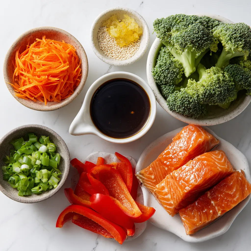 To start, the main ingredients are simple yet packed with flavor. Salmon fillets bring a rich taste and healthy fats. The teriyaki sauce adds a sweet and salty punch. Fresh vegetables like broccoli, red bell pepper, and carrots not only brighten the dish but also provide crunch and nutrients.