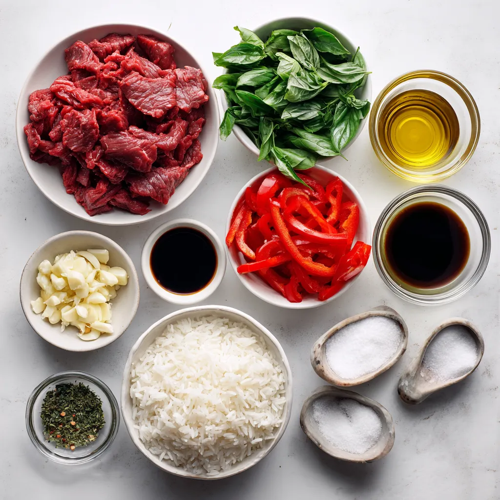 To make Thai Basil Beef Stir Fry, start by gathering your ingredients. You will need: