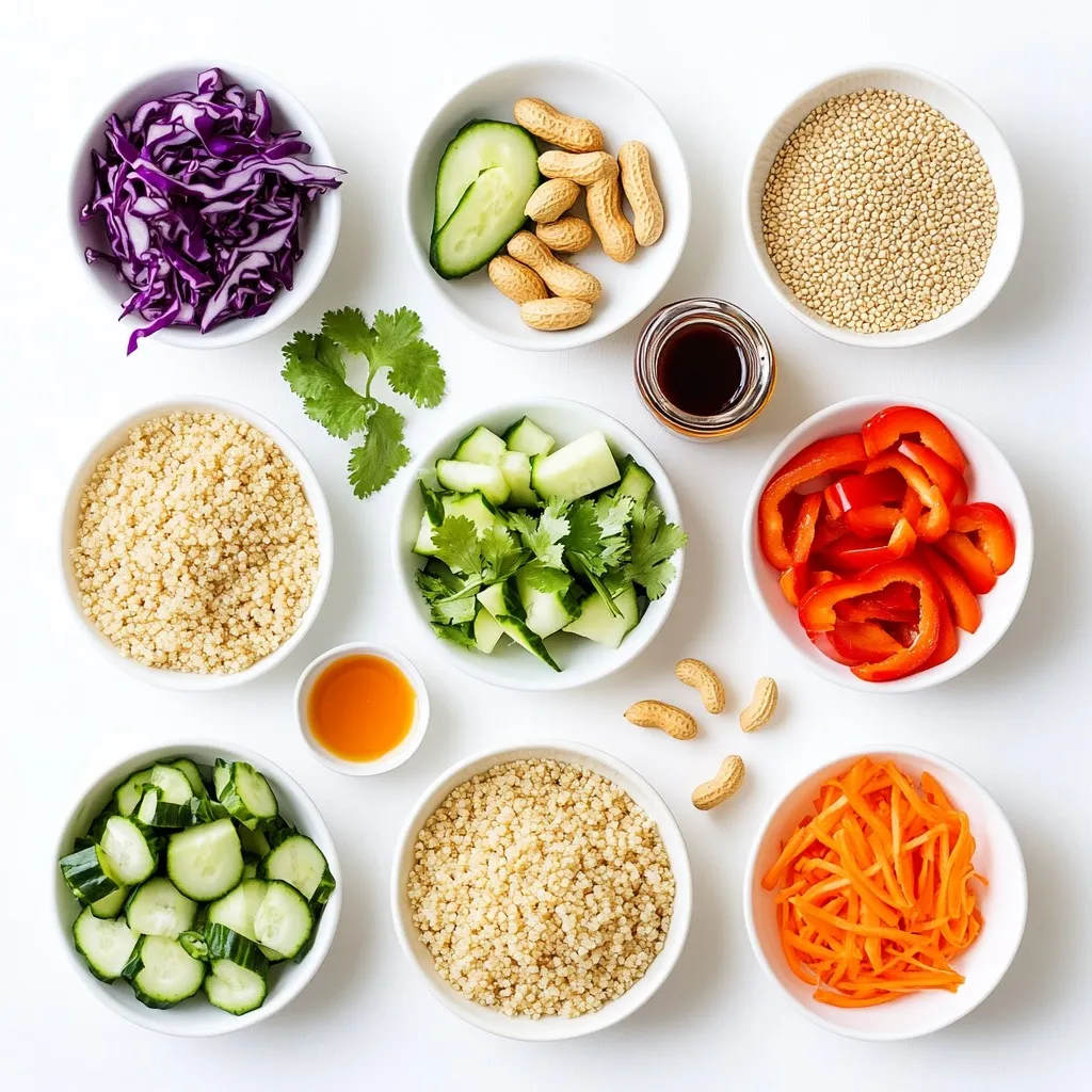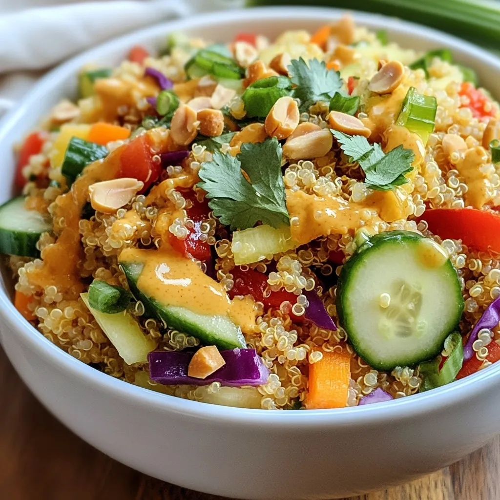 - 1 cup quinoa - 2 cups vegetable broth or water - 1 medium cucumber, diced - 1 red bell pepper, diced - 1 cup shredded carrots - 1 cup red cabbage, thinly sliced - 1/4 cup green onions, chopped - 1/4 cup fresh cilantro, chopped - 1/4 cup peanuts, chopped (for garnish) - 1/4 cup creamy peanut butter - 2 tablespoons soy sauce - 1 tablespoon fresh lime juice - 1 tablespoon maple syrup - 1 teaspoon sesame oil - 1 tablespoon grated ginger - 1 clove garlic, minced - Water (for thinning) Gather these ingredients before you start. You can find quinoa at most grocery stores. Make sure to rinse the quinoa well. This step helps remove the bitter coating called saponin. For the vegetables, choose fresh and colorful ones. The red bell pepper adds sweetness, while the cucumber gives crunch. Shredded carrots and red cabbage also bring texture. Green onions and cilantro add a burst of flavor. For the dressing, creamy peanut butter is key. It’s rich and smooth. Soy sauce adds saltiness, while lime juice gives a nice tang. Maple syrup balances the flavors with a hint of sweetness. Grated ginger and minced garlic add depth. If the dressing is too thick, add a bit of water to reach your desired consistency. This salad is bright, fresh, and perfect for any meal. You can serve it warm or cold. Enjoy the blend of flavors and textures with every bite! {{ingredient_image_1}} - Rinse 1 cup of quinoa under cold water. This helps remove any bitter taste. - In a medium saucepan, combine the rinsed quinoa and 2 cups of vegetable broth or water. Bring this to a boil over high heat. - Once boiling, reduce the heat to low. Cover the pan and let it simmer for about 15 minutes. - When the quinoa is fluffy and the liquid is gone, remove it from heat. Let it cool for a few minutes. - In a small bowl, add 1/4 cup of creamy peanut butter, 2 tablespoons of soy sauce, and 1 tablespoon each of fresh lime juice and maple syrup. - Next, add 1 teaspoon of sesame oil, 1 tablespoon of grated ginger, and 1 minced garlic clove. - Whisk all the ingredients together until smooth. If the dressing is too thick, add a little water to get the right consistency. - In a large bowl, combine the cooled quinoa with 1 medium diced cucumber, 1 diced red bell pepper, 1 cup of shredded carrots, and 1 cup of thinly sliced red cabbage. - Add 1/4 cup each of chopped green onions and fresh cilantro to the mixture. - Pour the peanut dressing over the salad and toss well to coat each ingredient. - Taste the salad and adjust the flavor by adding more lime juice or soy sauce if you like. - Let the salad sit for about 10 minutes. This helps the flavors mix well. - Serve in bowls, topped with 1/4 cup of chopped peanuts for a nice crunch. To avoid mushy quinoa, you need to rinse it well before cooking. Rinsing removes the saponins, which can make quinoa taste bitter. Use a fine mesh strainer for the best results. Here's how to rinse quinoa: - Place quinoa in a fine mesh strainer. - Rinse under cold water for about 1-2 minutes. - Agitate the quinoa with your hands to ensure even rinsing. After rinsing, use a ratio of 1 cup quinoa to 2 cups vegetable broth or water. Bring it to a boil, then cover and simmer on low for 15 minutes. Let it sit off the heat for 5 minutes. This helps keep it fluffy and prevents mushiness. To adjust the thickness of your peanut dressing, start with the base ingredients. If it feels too thick, slowly add water, a tablespoon at a time. Whisk well after each addition until you reach your desired consistency. For flavor adjustments, taste the dressing after mixing. If you want more tang, add lime juice. If you like it sweeter, add more maple syrup. Play around with the flavors to find what you enjoy the most. Serve the Thai peanut quinoa salad in bowls for a colorful display. You can also serve it on a large platter for sharing. For ideal pairings, consider adding sliced grilled chicken for protein. Tofu is a great vegan option too. This salad pairs well with fresh spring rolls or a light soup. Enjoy your meal with a refreshing drink, like iced tea or coconut water. Pro Tips Rinse the Quinoa: Always rinse quinoa before cooking to remove its natural coating, called saponin, which can give it a bitter taste. Add More Veggies: Feel free to add any seasonal vegetables you like, such as cherry tomatoes or snap peas, to enhance the salad's flavor and nutrition. Make Ahead: This salad can be made a day in advance; just keep the dressing separate until you’re ready to serve to maintain freshness. Customize the Dressing: Adjust the sweetness or saltiness of the peanut dressing by varying the amount of maple syrup or soy sauce to suit your taste. {{image_2}} You can swap out the cucumber and bell pepper for many other veggies. Try using diced zucchini or sliced radishes. These will add different flavors and textures. You can also use seasonal vegetables. In summer, fresh corn or cherry tomatoes work well. In fall, roasted butternut squash is a tasty choice. Want to boost the protein? Add grilled chicken or cubes of tofu. Chicken adds a savory flavor, while tofu makes it vegan-friendly. You can also try chickpeas or edamame for extra protein. These options keep the salad filling without losing its fresh taste. Not a fan of peanuts? You can choose nut-free dressings. A tahini or sunflower seed butter dressing is a great swap. You can also make your own. Mix olive oil, lemon juice, and a touch of maple syrup for a light dressing. This keeps the salad creamy and delicious without the nuts. Store your Thai peanut quinoa salad in an airtight container. This keeps it fresh longer. Use glass or plastic containers with tight lids. If you have multiple servings, divide them into smaller containers. This way, you can grab a portion easily. The salad stays fresh for about 3 to 5 days in the fridge. After that, the veggies may wilt and lose taste. Look for signs of spoilage, like a sour smell or slimy texture. If the salad smells off or looks bad, toss it o