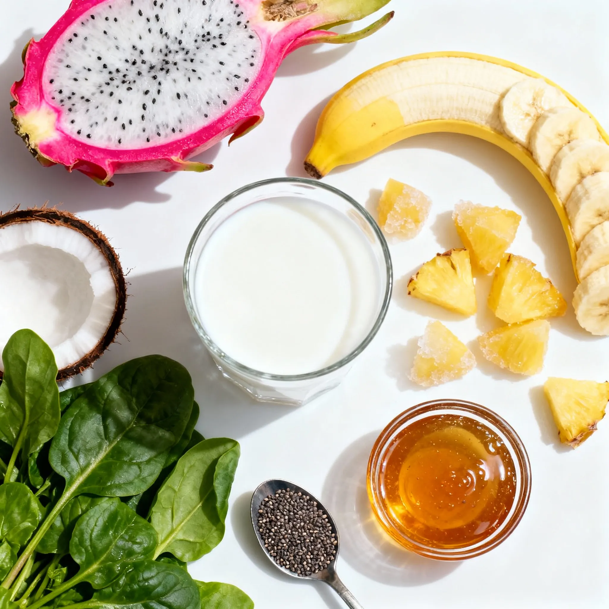 Each ingredient plays a special role. Dragon fruit adds a vibrant color and unique flavor. Bananas bring natural sweetness and creaminess. Coconut milk gives a rich, tropical feel. Frozen pineapple chunks add a refreshing twist. Honey or agave syrup sweetens the smoothie to your liking. Chia seeds provide fiber and nutrients. Spinach can boost health without changing the taste. Ice cubes help make the smoothie thicker, if desired.