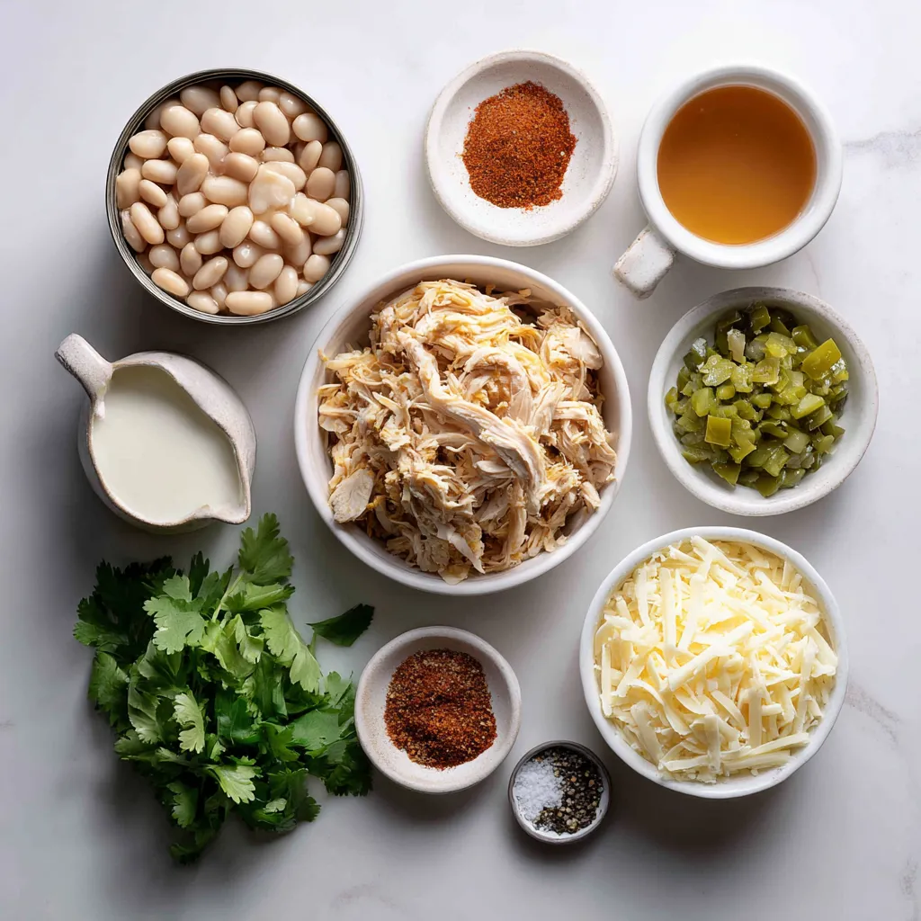 These ingredients create a hearty and creamy dish. The cooked chicken gives it protein and flavor. White beans add a nice texture. Green chilies bring some heat, while spices like cumin and chili powder add depth.